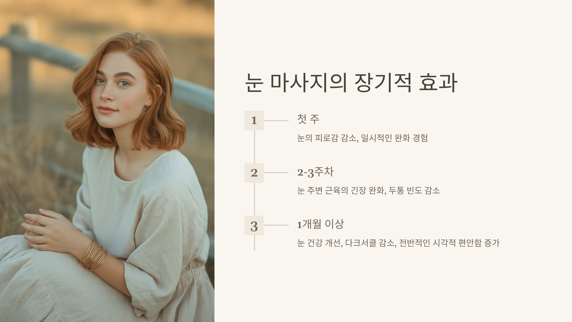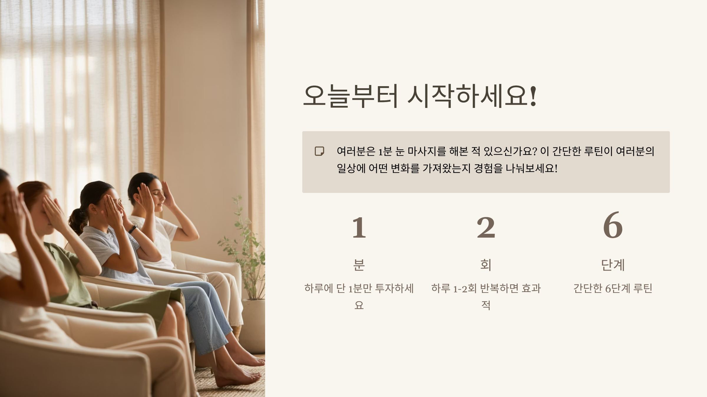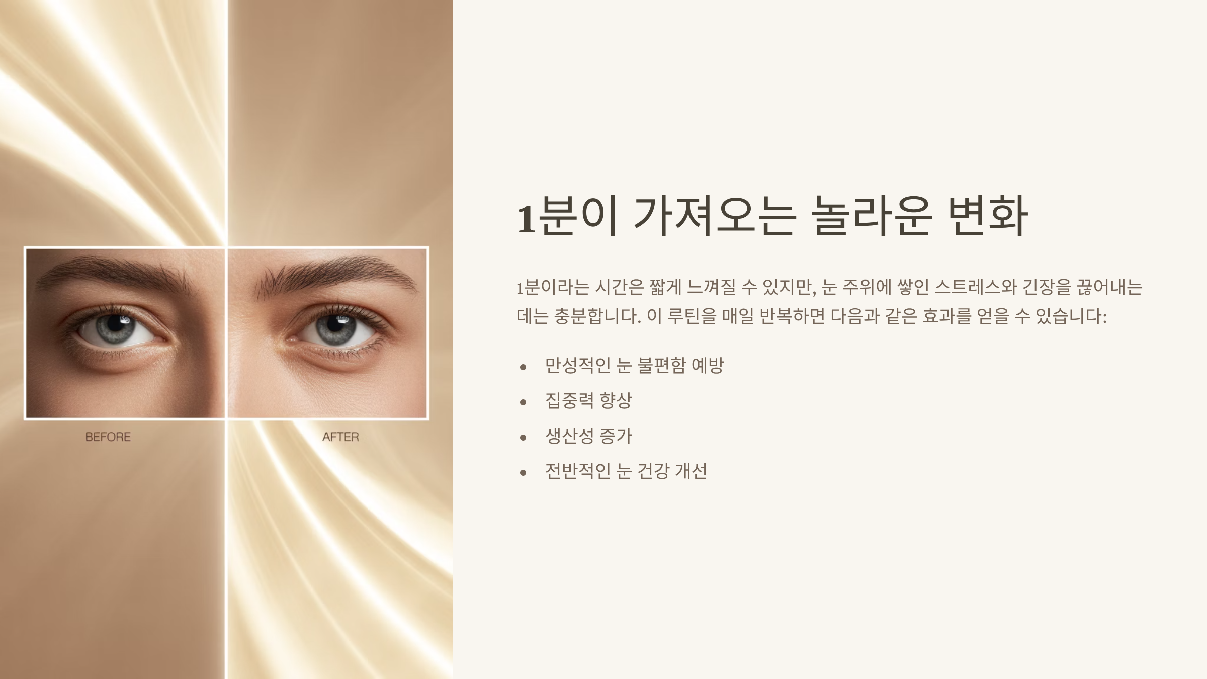 1분이라는 시간은 짧게 느껴질 수 있지만, 눈 주위에 쌓인 스트레스와 긴장을 끊어내는 데는 충분합니다. 이 루틴을 매일 반복하면 만성적인 불편함을 예방하고 집중력과 생산성 향상에도 도움이 됩니다.