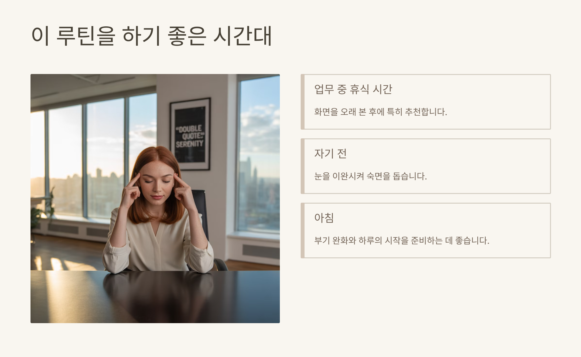 - 업무 중 휴식 시간: 화면을 오래 본 후에 특히 추천합니다.