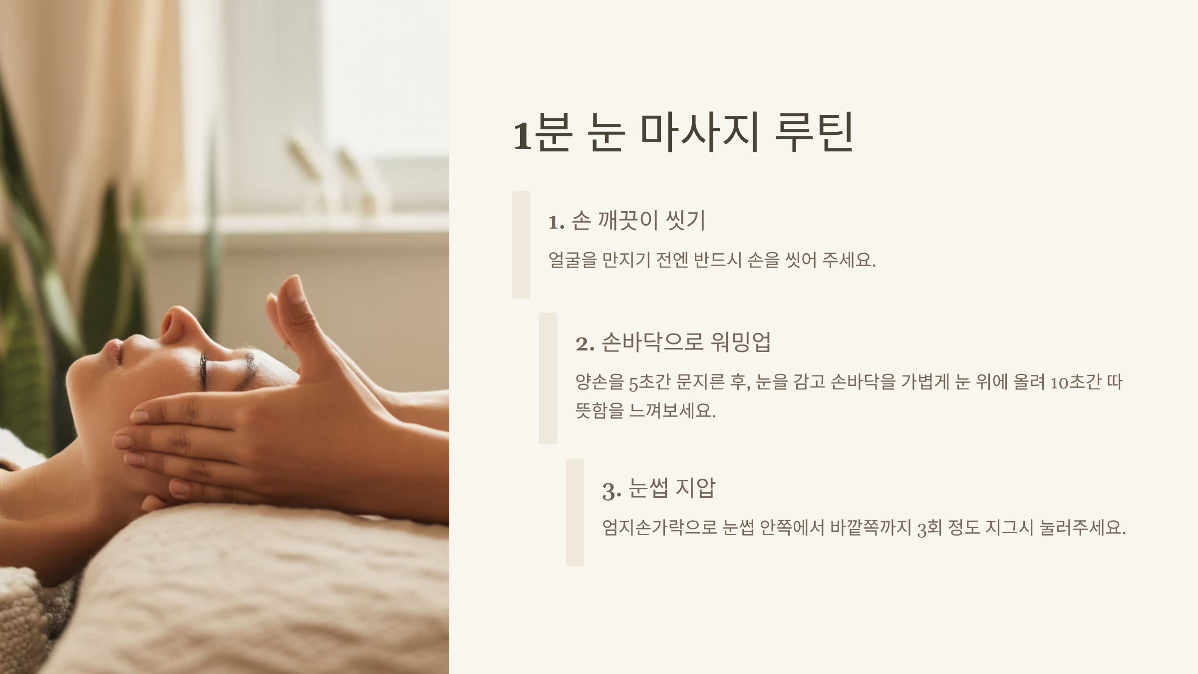 1분이라는 시간은 짧게 느껴질 수 있지만, 눈 주위에 쌓인 스트레스와 긴장을 끊어내는 데는 충분합니다. 이 루틴을 매일 반복하면 만성적인 불편함을 예방하고 집중력과 생산성 향상에도 도움이 됩니다.