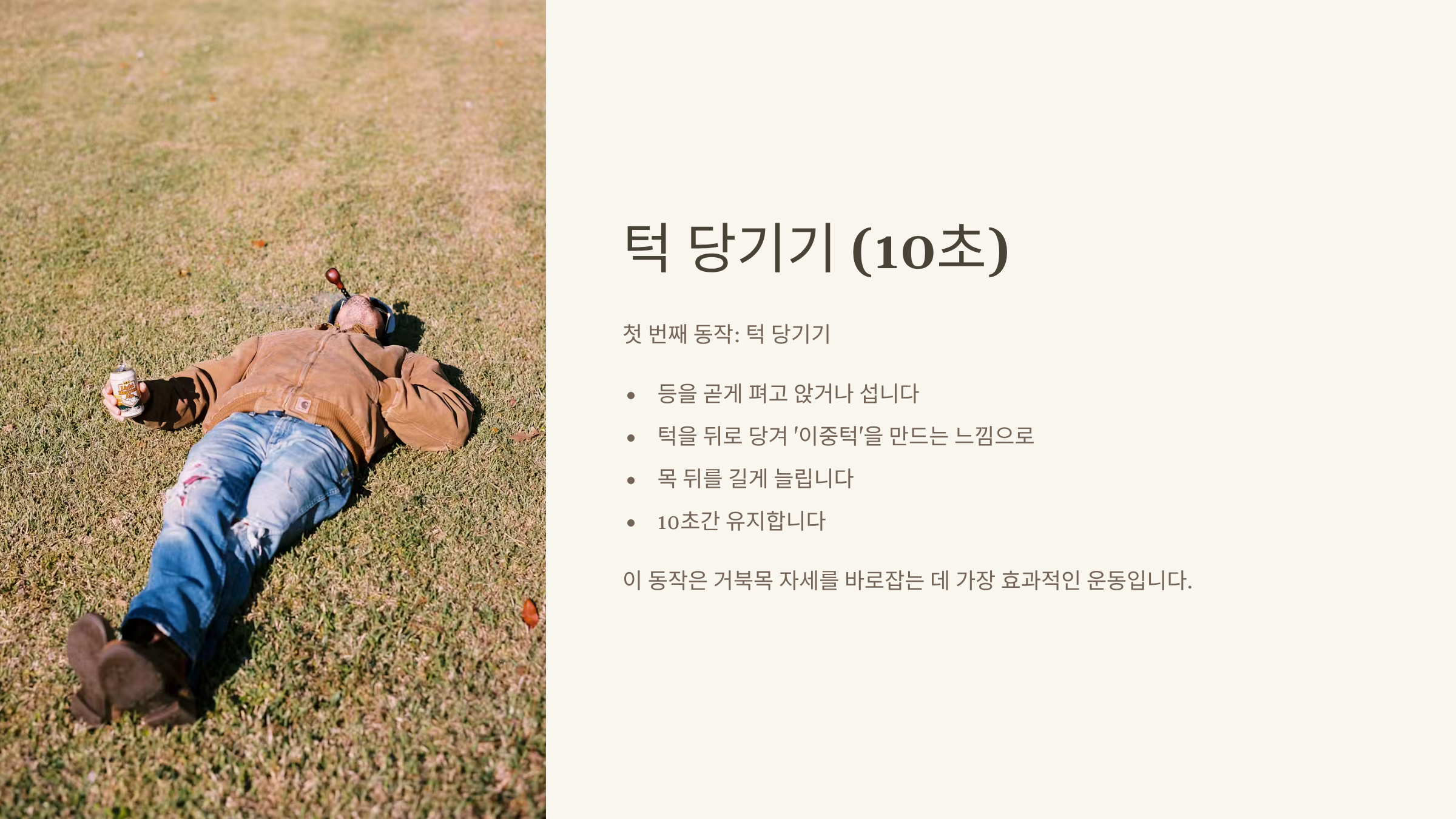 - 턱 당기기 (10초): 등을 곧게 펴고 턱을 뒤로 당겨 ‘이중턱’을 만드는 느낌으로 목 뒤를 길게 늘립니다.