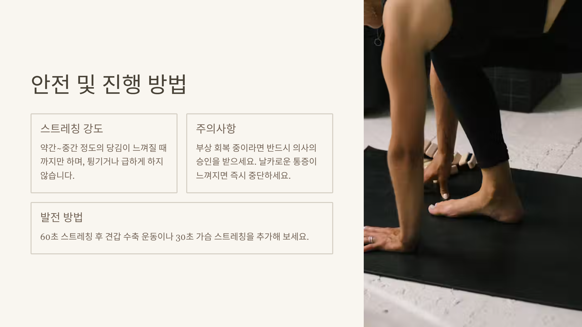 모든 동작은 코로 호흡하며, 통증이 없는 범위에서만 진행하고 날카로운 통증이 느껴지면 즉시 중단하세요.
