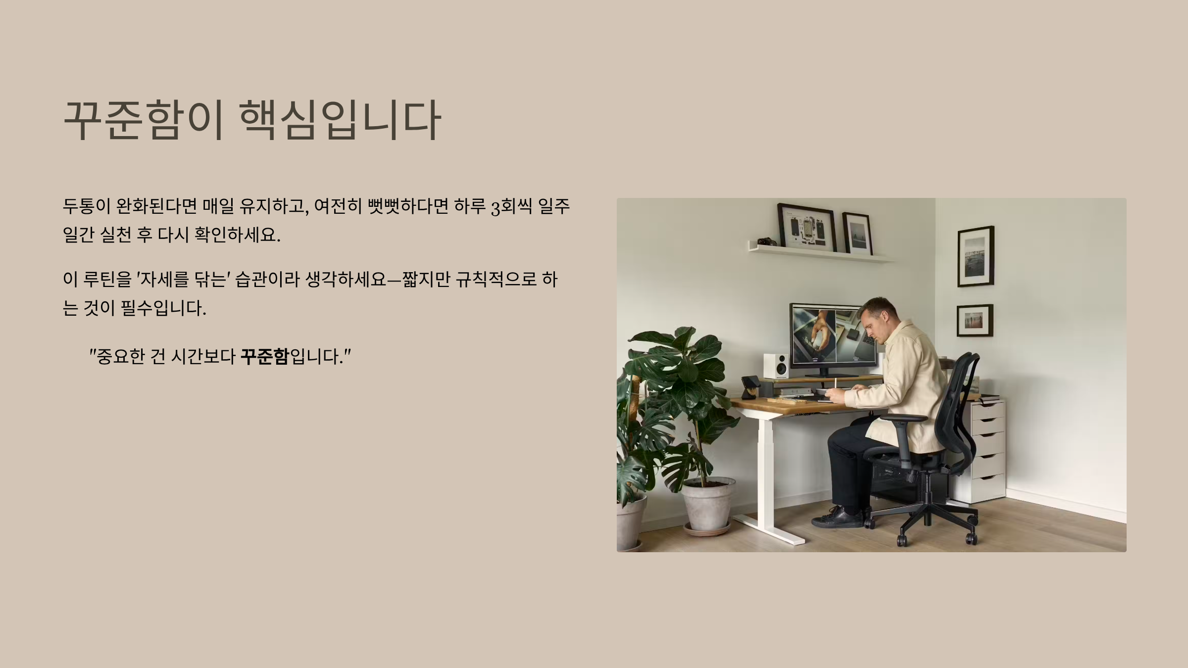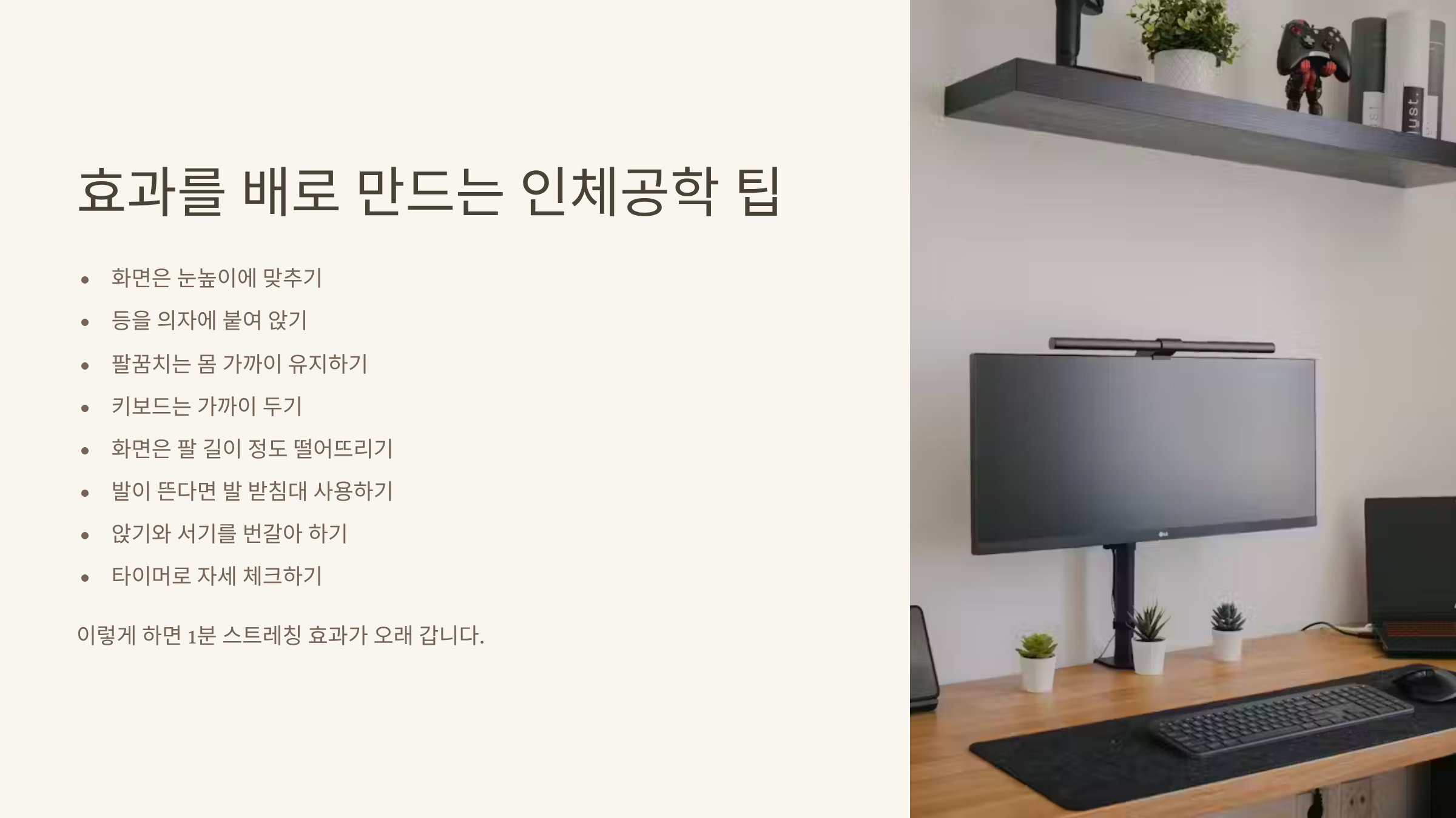 화면은 눈높이에 맞추고, 등을 의자에 붙여 앉으며, 팔꿈치는 몸 가까이 유지하세요. 키보드는 가까이 두고, 화면은 팔 길이 정도 떨어뜨립니다. 발이 뜬다면 발 받침대를 사용하고, 앉기와 서기를 번갈아 하며, 타이머로 자세 체크를 하세요. 이렇게 하면 1분 스트레칭 효과가 오래 갑니다.