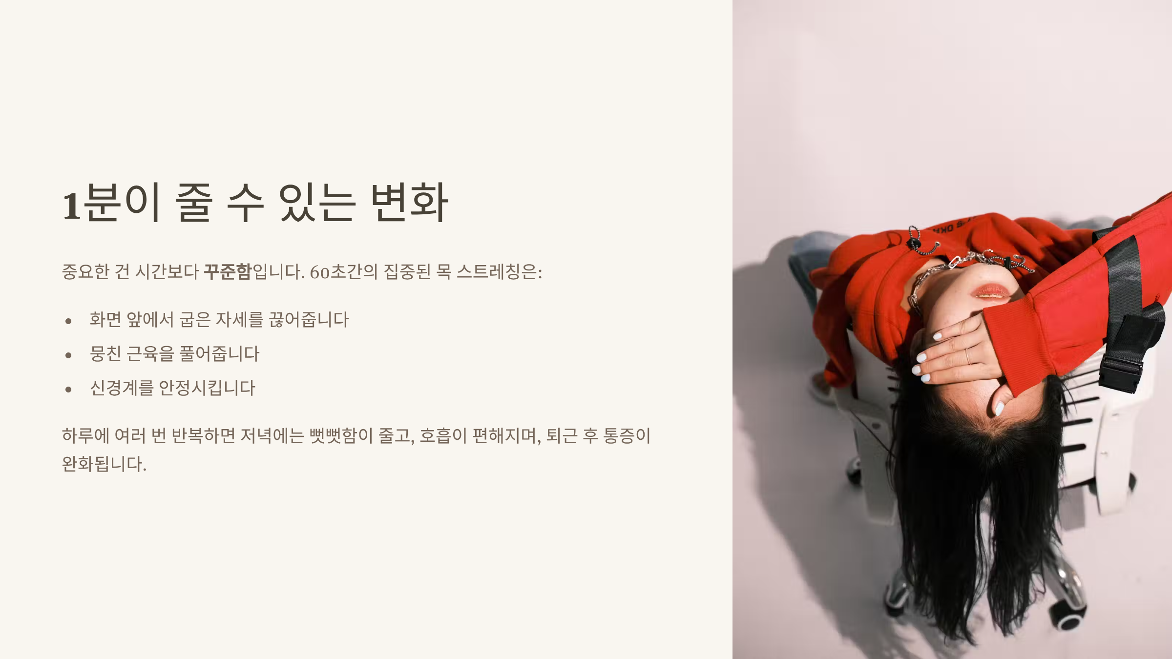 중요한 건 시간보다 꾸준함입니다. 60초간의 집중된 목 스트레칭은 화면 앞에서 굽은 자세를 끊어주고, 뭉친 근육을 풀며, 신경계를 안정시킵니다. 하루에 여러 번 반복하면 저녁에는 뻣뻣함이 줄고, 호흡이 편해지며, 퇴근 후 통증이 완화됩니다. 이를 ‘자세를 닦는’ 습관이라 생각하세요—짧지만 규칙적으로 하는 것이 필수입니다.