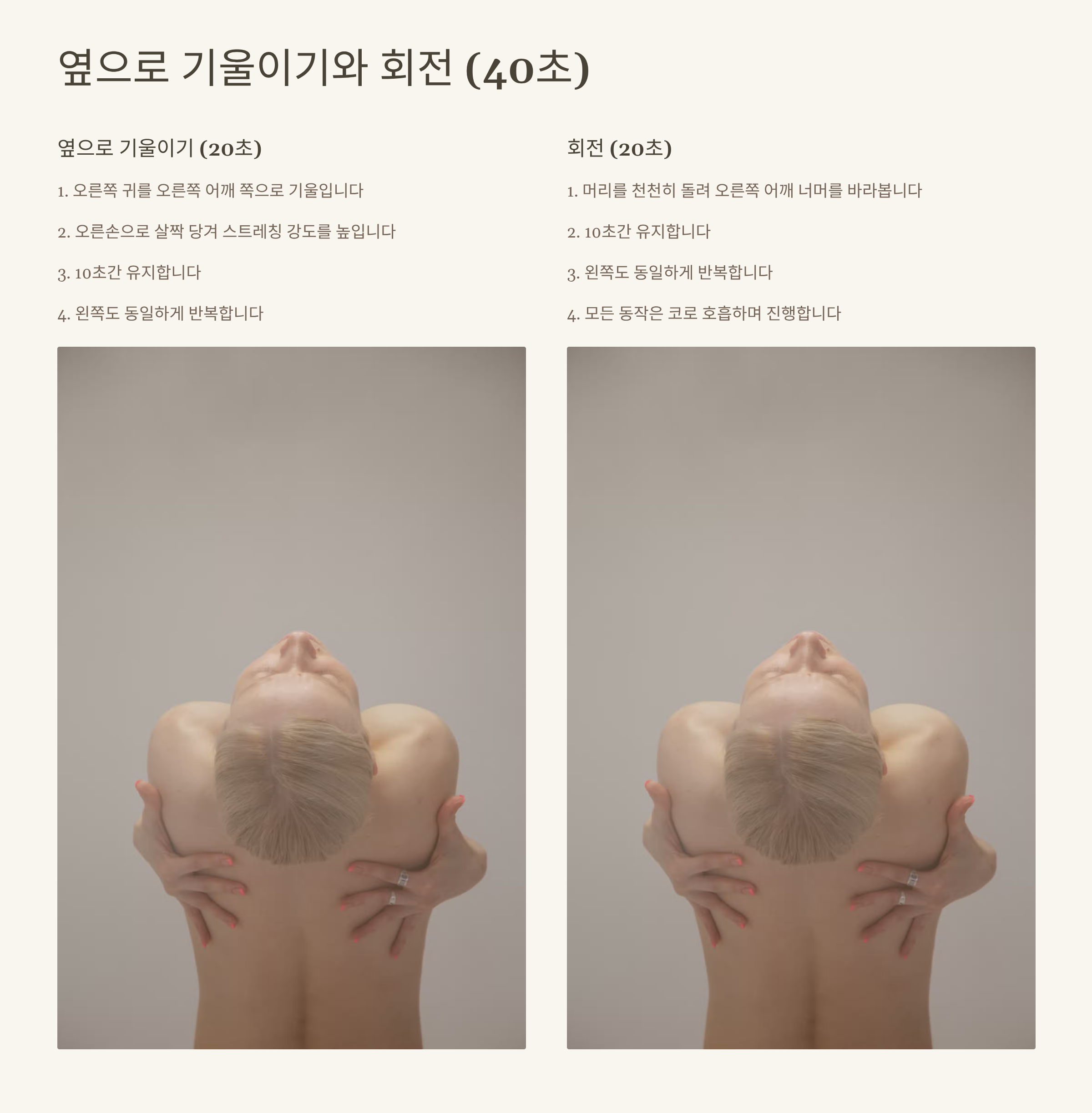 3. 회전 (20초): 머리를 천천히 돌려 오른쪽 어깨 너머를 바라보고(10초), 왼쪽도 동일하게(10초).