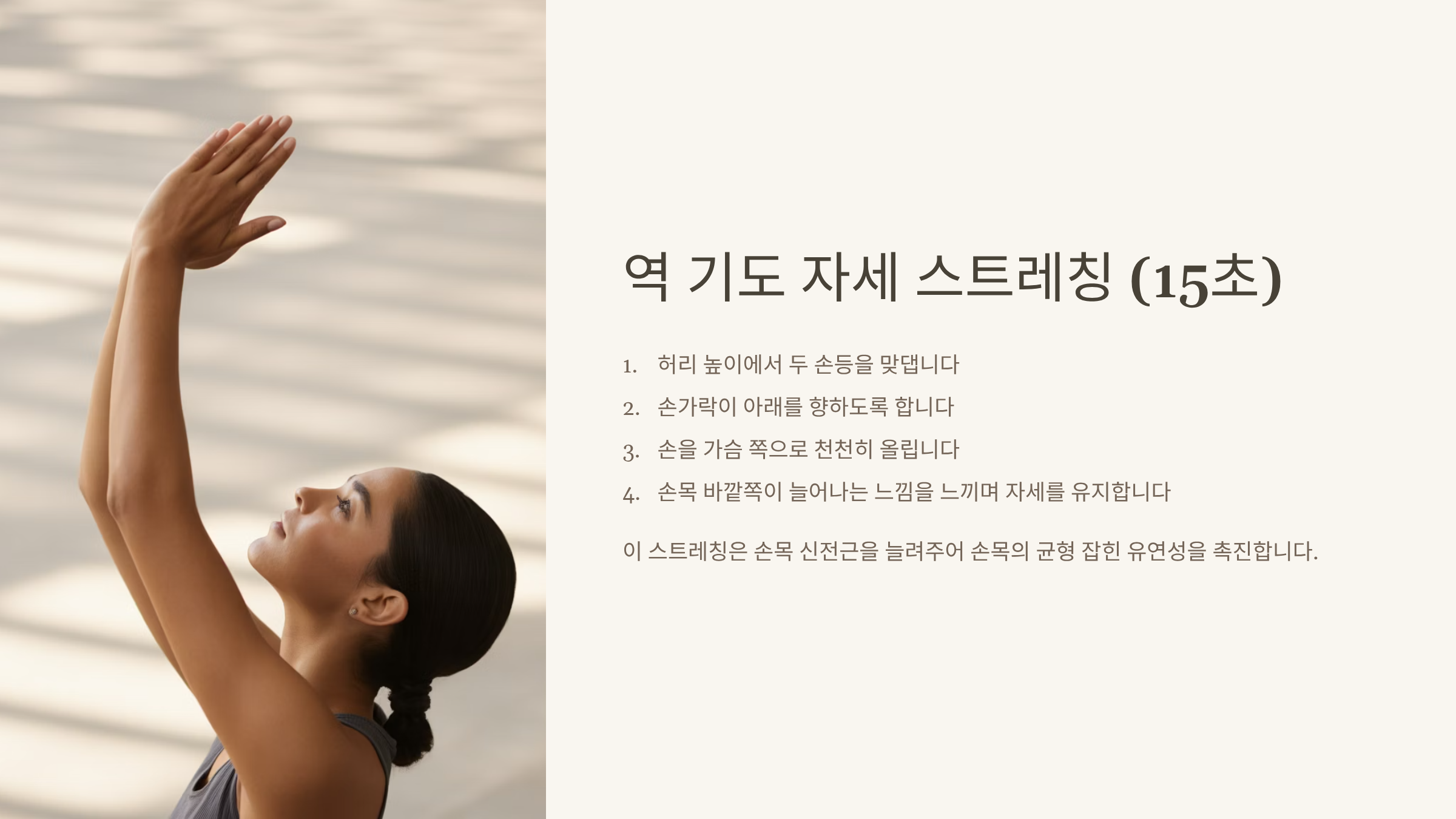 - 역 기도 자세 스트레칭 (15초): 허리 높이에서 두 손등을 맞대고, 손가락이 아래를 향하도록 한 뒤, 손을 가슴 쪽으로 천천히 올려줍니다.