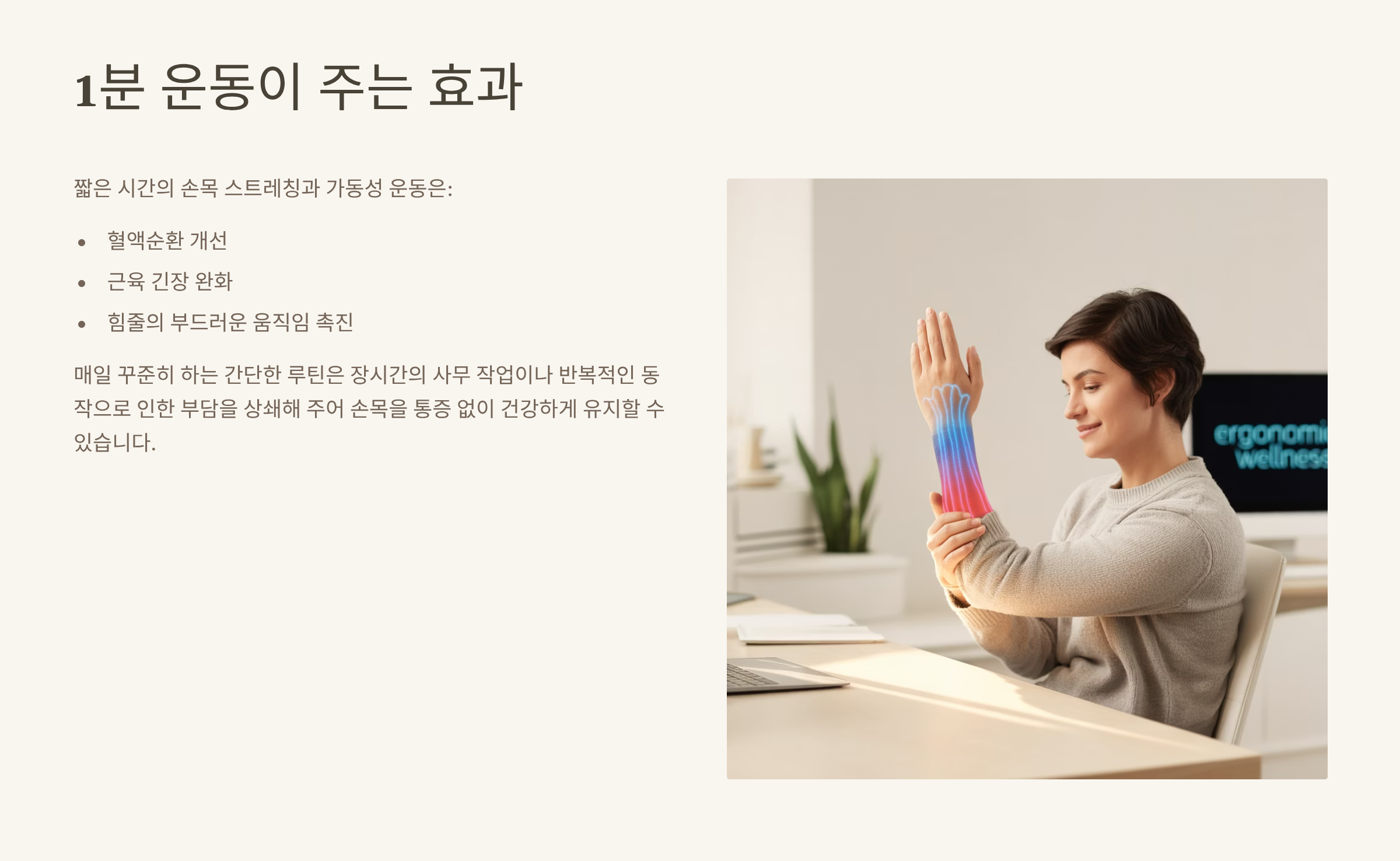 사무직 근로자, 게이머, 손을 자주 사용하는 모든 사람을 위한 손목 건강과 유연성을 지키는 간단한 하루 1분 루틴입니다.