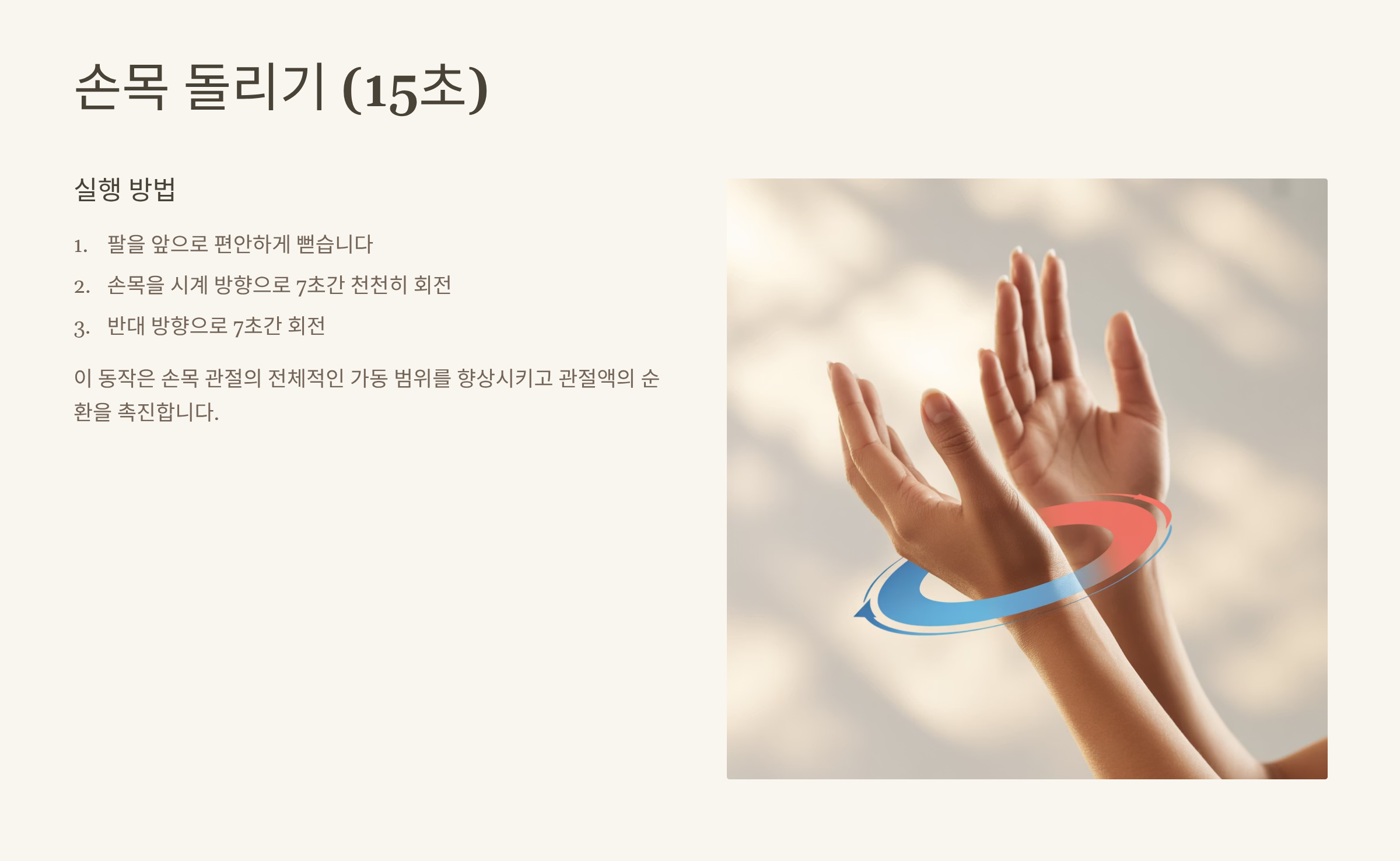 - 손목 돌리기 (15초): 팔을 앞으로 뻗고 손목을 시계 방향으로 7초간 돌린 뒤, 반대 방향으로 7초간 돌립니다.