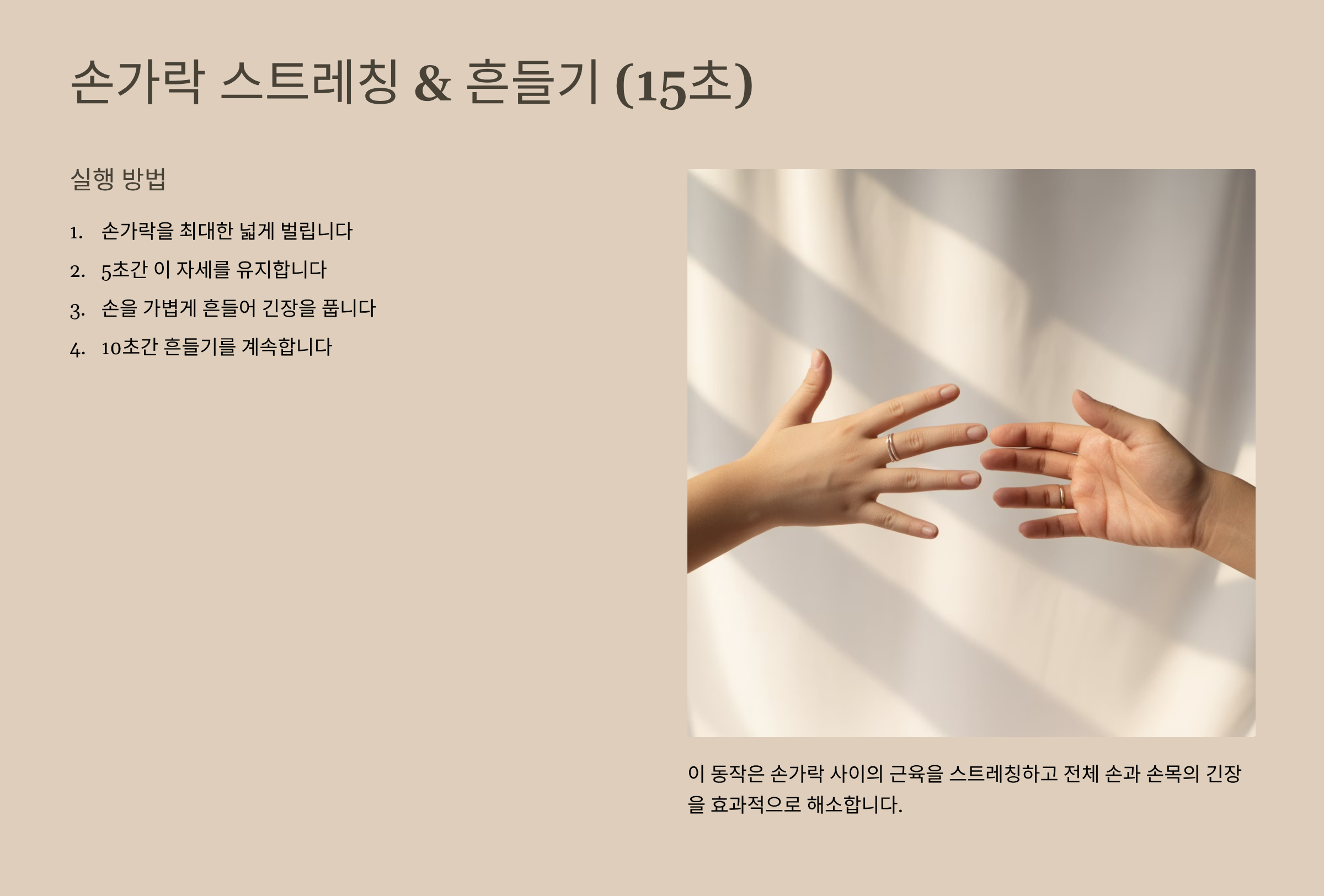- 손가락 스트레칭 & 흔들기 (15초): 손가락을 최대한 벌리고 5초간 유지한 후, 손을 가볍게 흔들어 긴장을 풉니다.