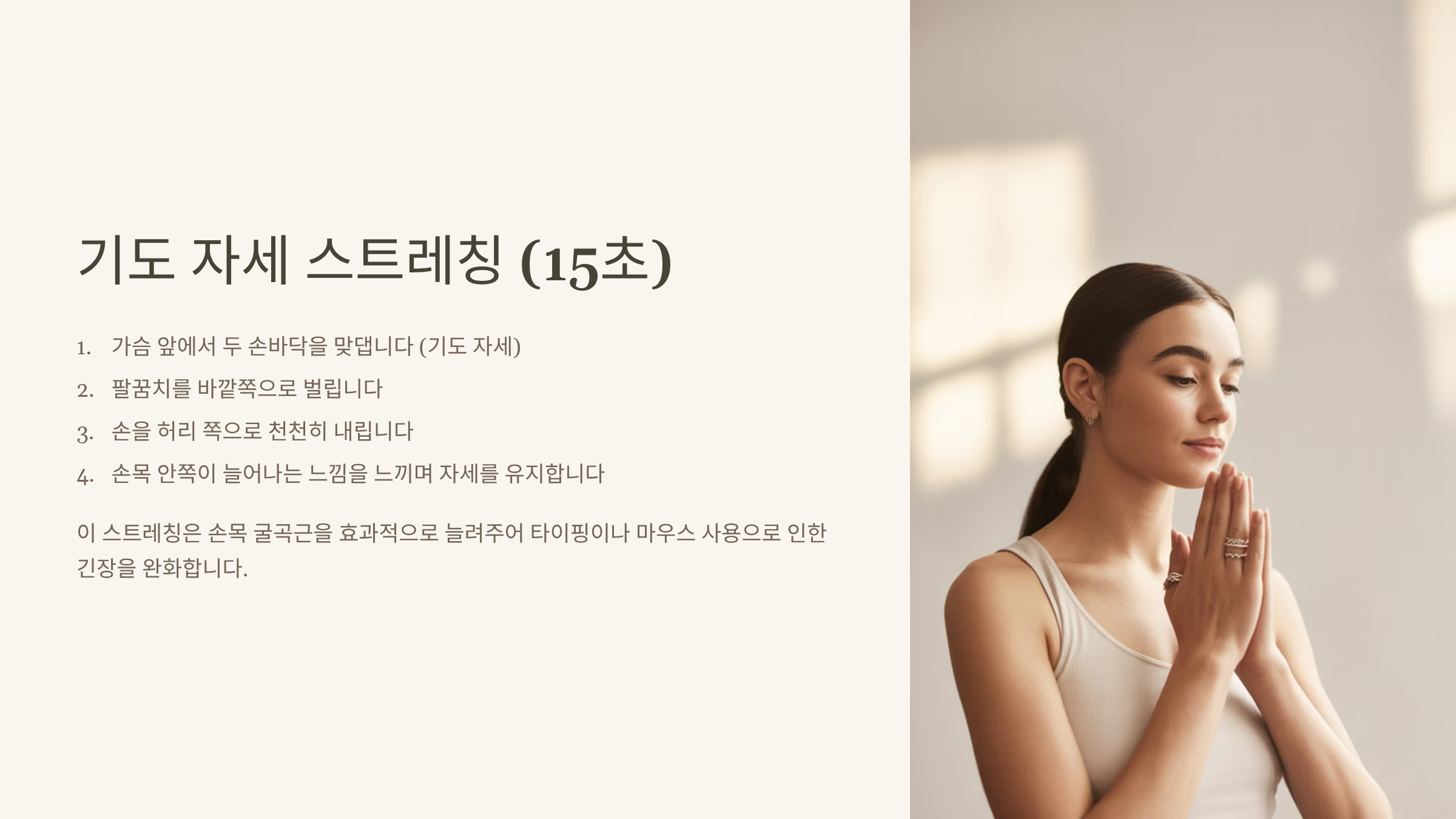 - 기도 자세 스트레칭 (15초): 가슴 앞에서 두 손바닥을 맞대고(기도 자세), 팔꿈치를 벌린 채 손을 허리 쪽으로 천천히 내려 손목 안쪽이 늘어나는 느낌을 느낍니다. 유지하세요.