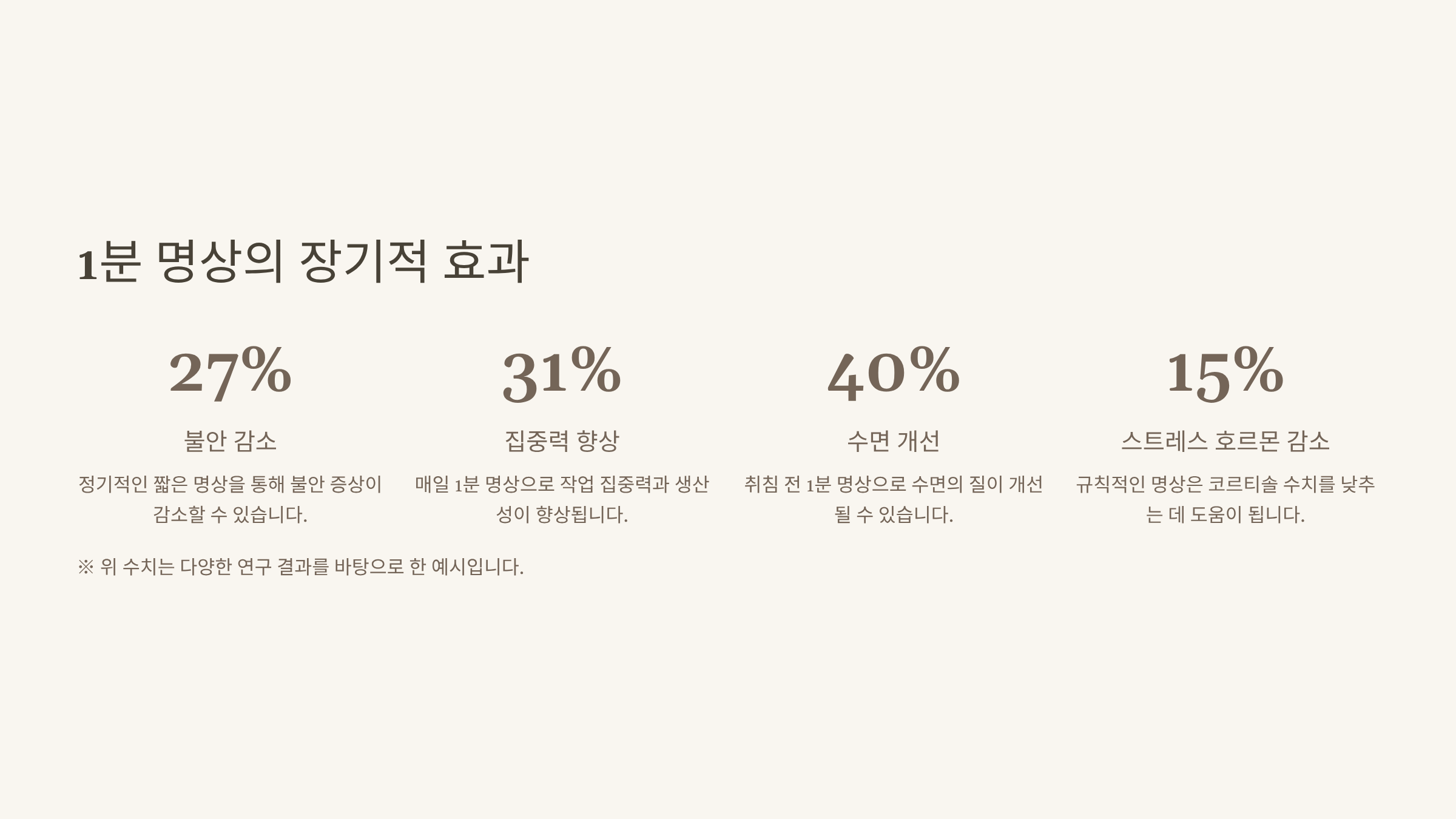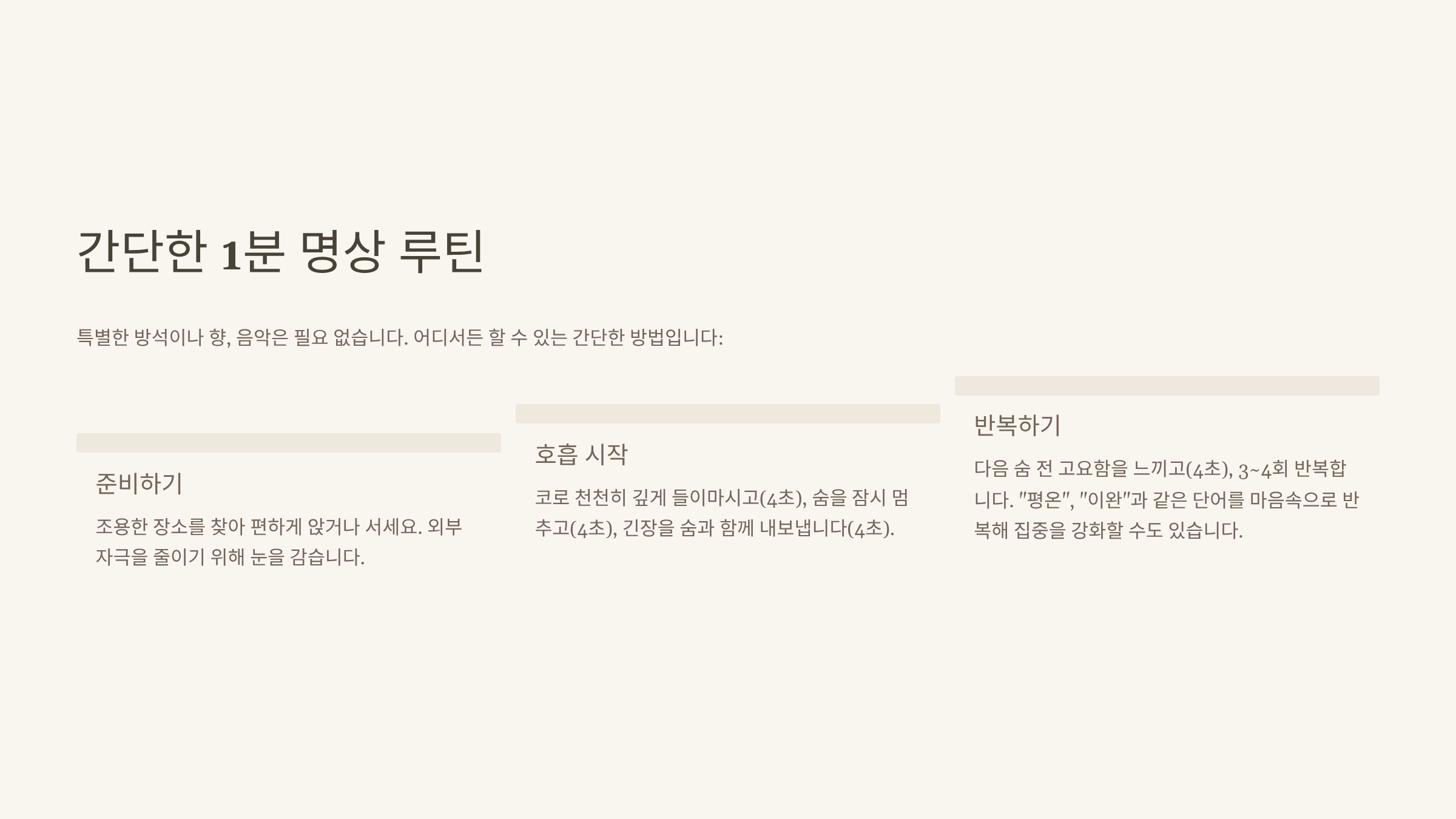 분주한 세상 속에서 명상은 시간이 있어야만 할 수 있는 여유처럼 느껴질 수 있습니다. 하지만 연구와 실제 경험에 따르면, 단 1분 동안 호흡에 집중하는 것만으로도 불안을 현저히 줄일 수 있습니다. 중요한 것은 명상의 시간보다 얼마나 꾸준하고 의식적으로 하느냐입니다.