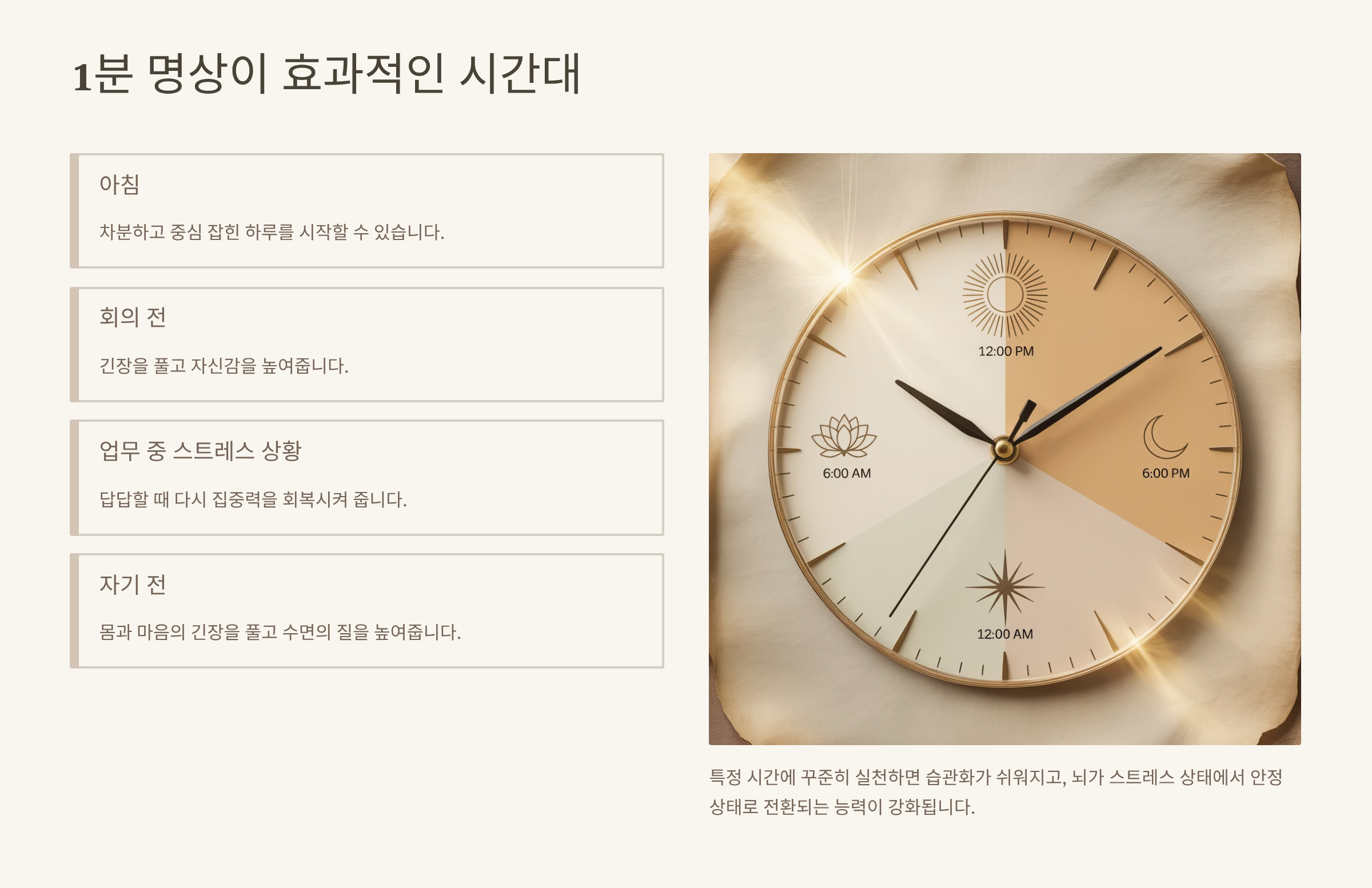 특정 시간에 꾸준히 실천하면 습관화가 쉬워지고, 뇌가 스트레스 상태에서 안정 상태로 전환되는 능력이 강화됩니다.