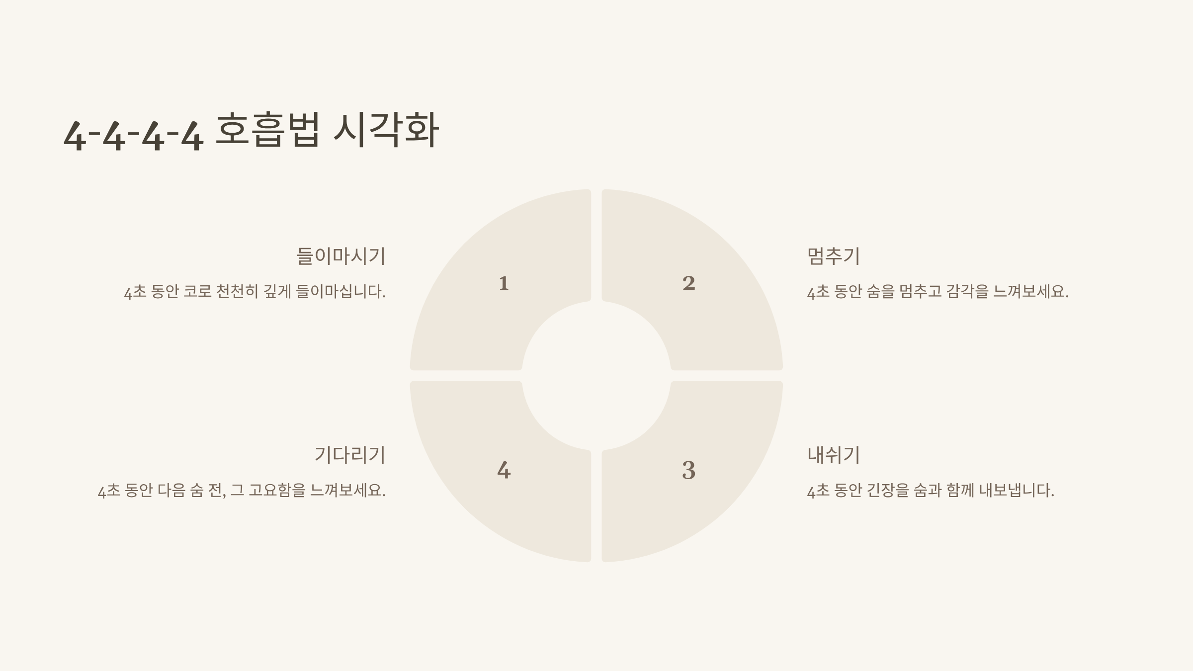 - 천천히 내쉬기 (4초): 긴장을 숨과 함께 내보냅니다.
